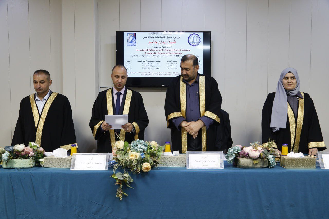 ناقشت رسالة ماجستير في كلية الهندسة بجامعة ديالى السلوك الإنشائي للعتبات المركبة الفولاذية–الخرسانية ذات المقطع (U) المزودة بفتحات خدمية، للطالبة طيبة زيدان جاسم، وذلك في قاعة عمادة كلية الهندسة.