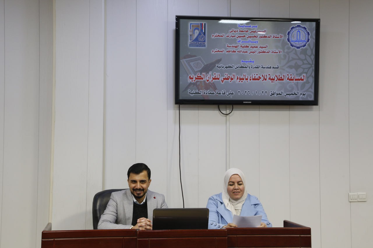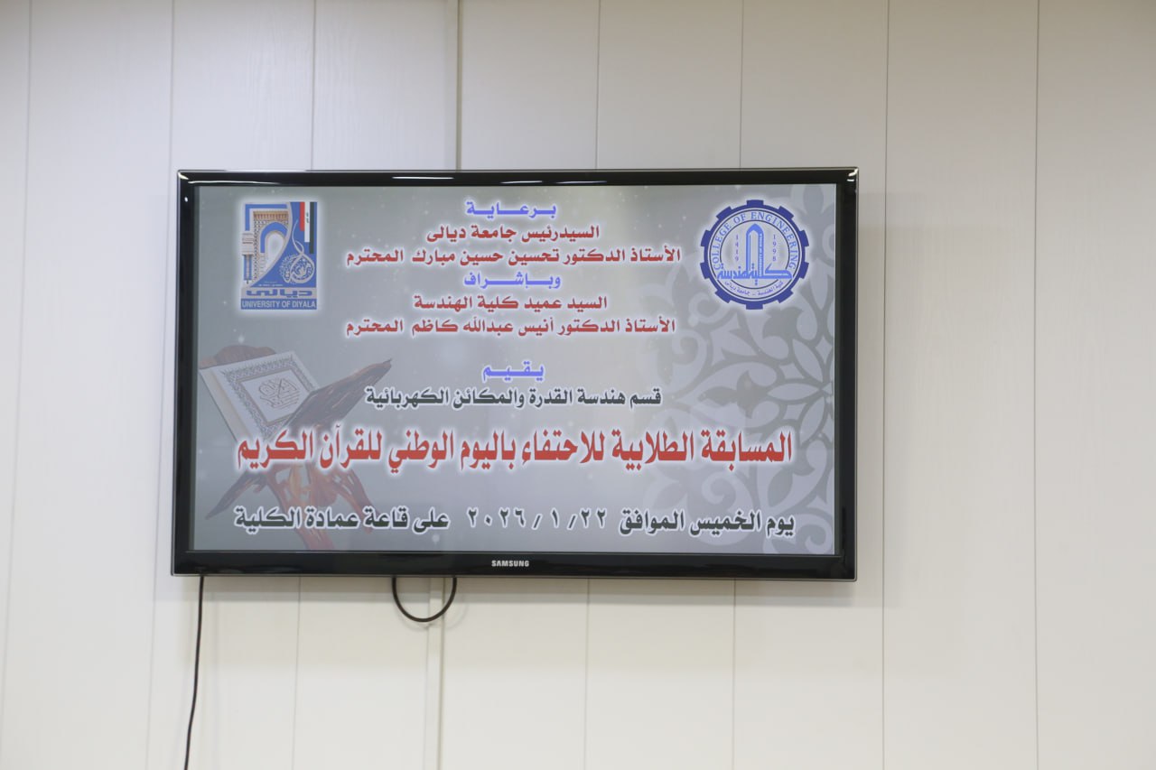 برعاية السيد رئيس جامعة ديالى الأستاذ الدكتور تحسين حسين مبارك المحترم، وبإشراف عميد كلية الهندسة الأستاذ الدكتور أنيس عبد الله كاظم المحترم، أقام قسم هندسة القدرة والمكائن الكهربائية وبالتعاون مع شعبة النشاطات الطلابية في الكلية مسابقة دينية بمناسبة اليوم الوطني للقرآن الكريم، بمشاركة واسعة من طلبة الكلية وعدد من التدريسيين، في أجواء إيمانية سادتها روح التنافس الشريف وتعظيم القيم القرآنية.