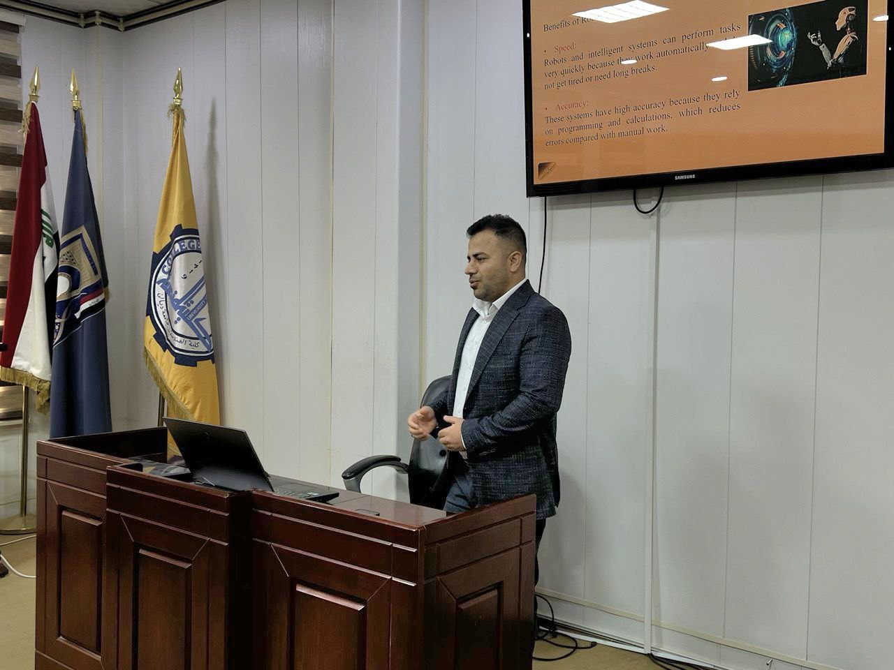 ضمن فعاليات أسبوع الريادة العالمي، و وفق توجيهات وزارة التعليم العالي والبحث العلمي الرامية إلى تعزيز ثقافة الابتكار والتحول الرقمي في المؤسسات الأكاديمية، نظّمت كلية الهندسة دورة علمية متخصصة بعنوان “الروبوتات والأنظمة الذكية: آفاق الابتكار والتطبيق”، ألقاها م.د. محمد حشمت عبدالكريم.