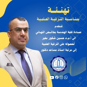 تهنئ عمادة كلية الهندسة متمثلةً بعميدها الأستاذ الدكتور أنيس عبد الله كاظم المحترم و مجلسها الموقر الاستاذ المساعد الدكتور حسين شكور مغير المحترم التدريسي في قسم هندسة الاتصالات بمناسبة حصولهِ على لقب استاذ مساعد متمنين له المزيد من الموفقية والنجاح.