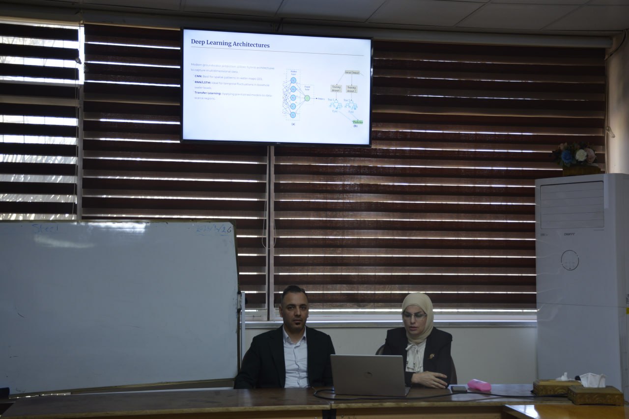 أقامت كلية الهندسة دورة علمية بعنوان (Integrating GIS and Deep Learning for Groundwater Prediction) حاضر فيها كلٌّ من م.د. مخلد عزت و م.م. جنة علي، تناولت آليات دمج نظم المعلومات الجغرافية (GIS) مع تقنيات التعلم العميق (Deep Learning) لتعزيز كفاءة مراقبة وإدارة موارد المياه الجوفية.
