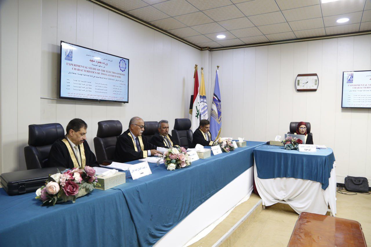 كلية الهندسة تناقش رسالة ماجستير حول دراسة مختبرية لتأثير الكهرباء الأوزموزية في تربة ذات طبقتين مختلفتين