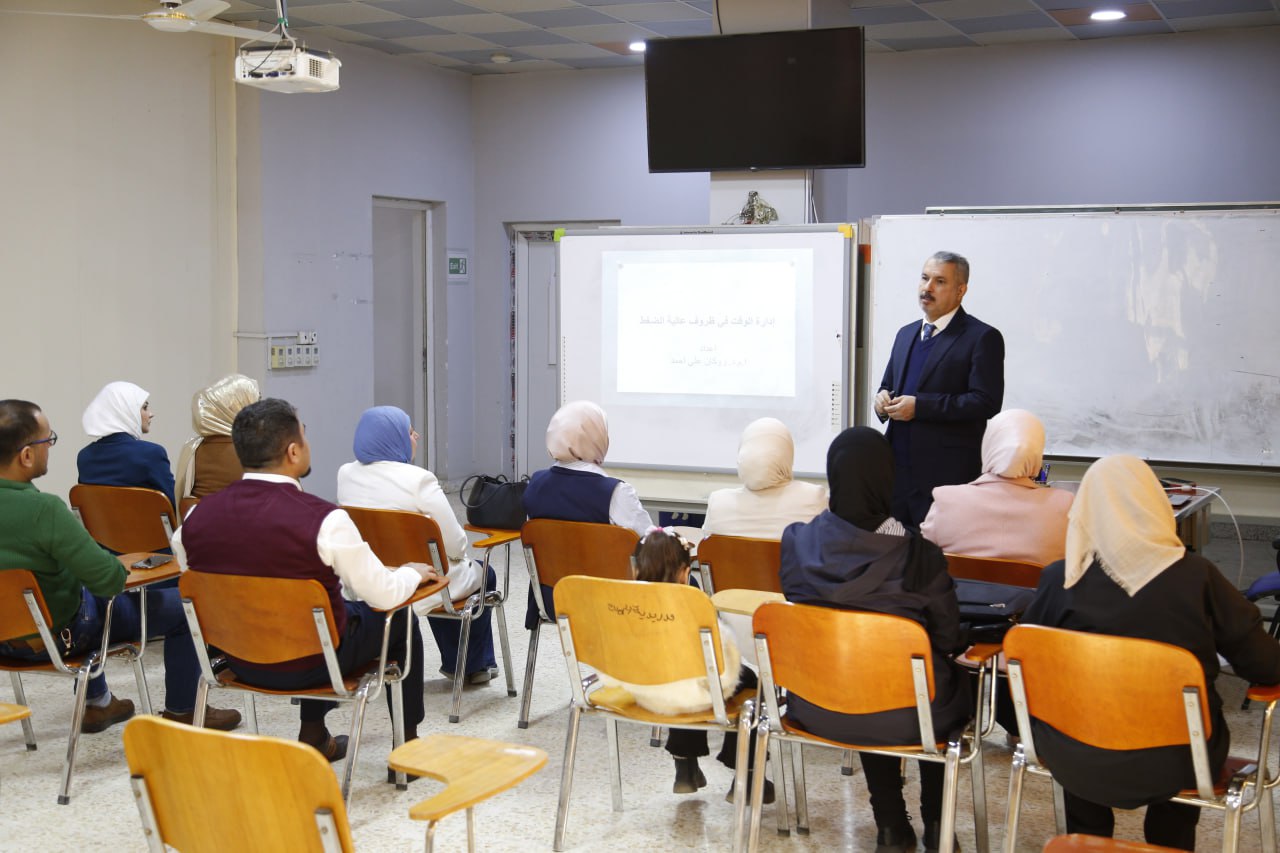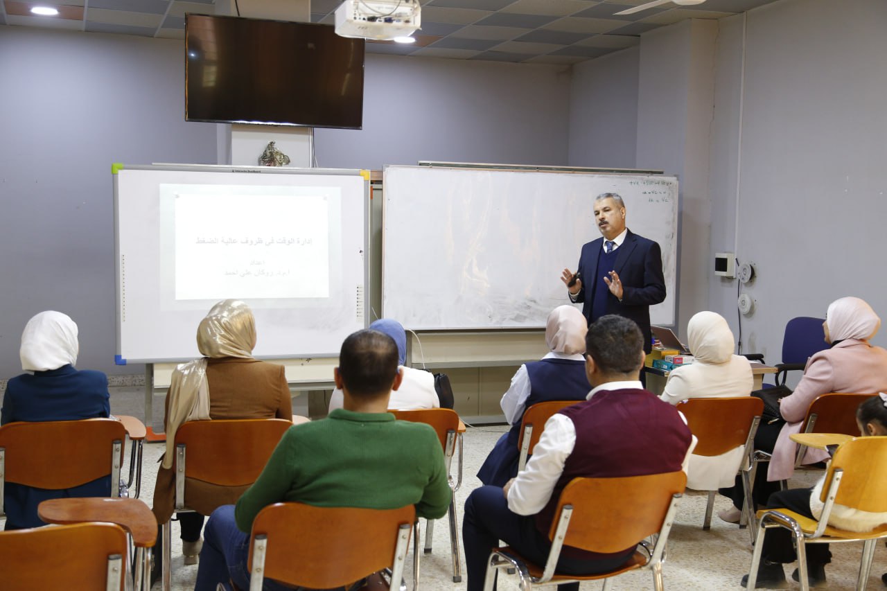 تناولت الورشة موضوع إدارة الوقت لدى طلبة الدراسات العليا في ظل الضغوط الدراسية وتعدد المهام وضيق الوقت، وما قد يرافق ذلك من شعور بالإرهاق أو الميل إلى التسويف، إذ جرى تسليط الضوء على مفهوم الضغط وتأثيره في مستوى الأداء والإنتاجية الأكاديمية.