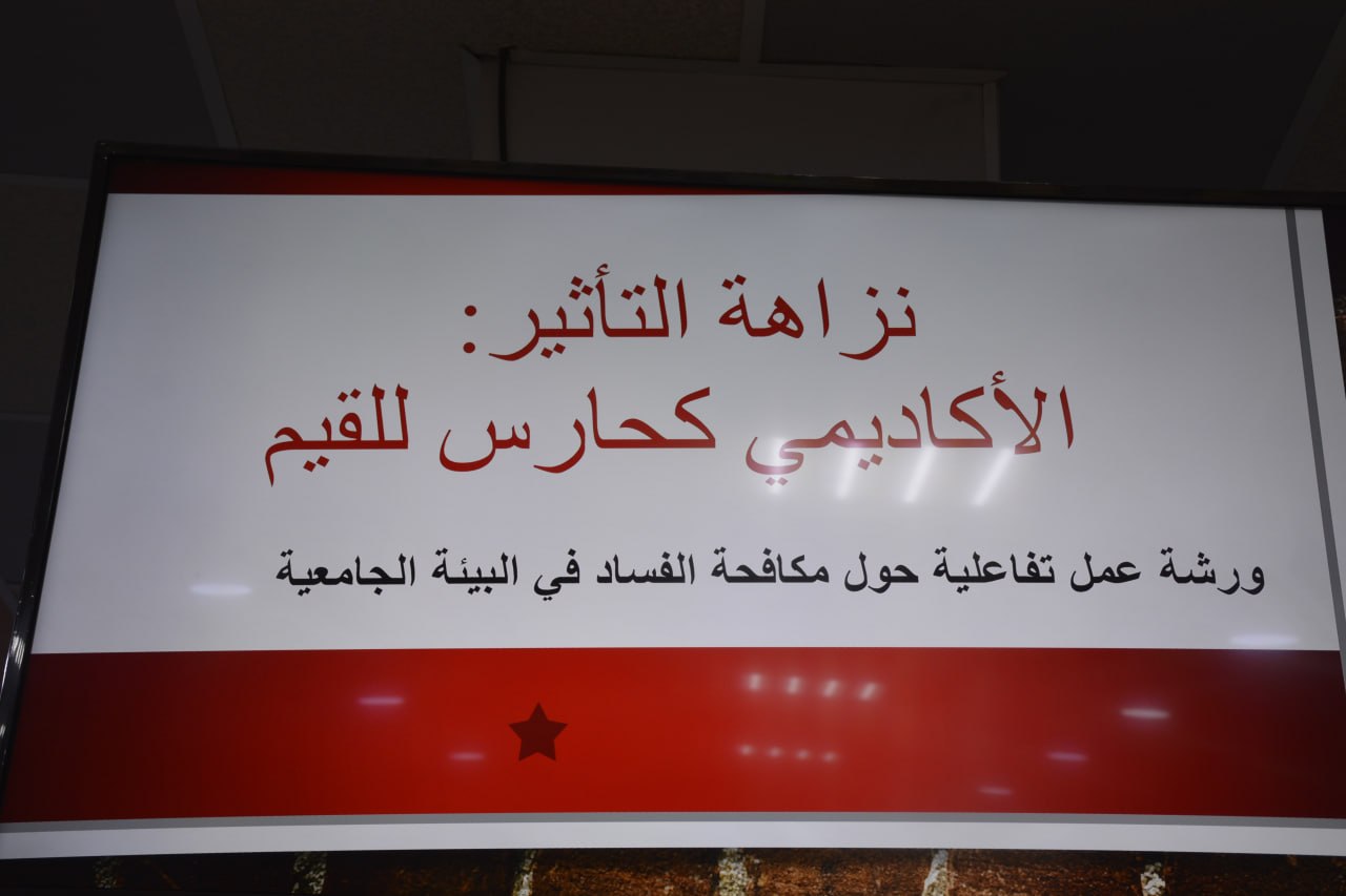 وتأتي هذه الورشة في إطار حرص الكلية على نشر ثقافة النزاهة المؤسسية وتعزيز مبادئ الحوكمة الرشيدة، بما ينسجم مع أهداف التنمية المستدامة، ولاسيما ما يتعلق ببناء مؤسسات قوية قائمة على الشفافية والمساءلة.