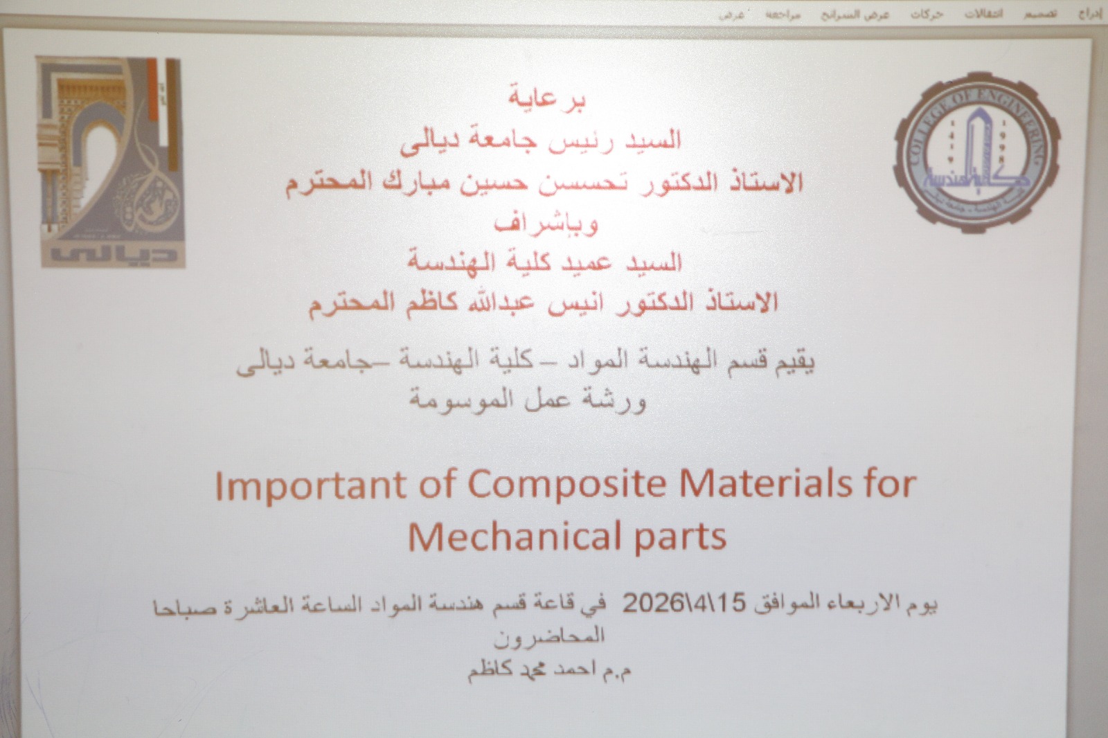 نظّم قسم هندسة المواد في كلية الهندسة بجامعة ديالى، بالتعاون مع شعبة التعليم المستمر، ورشة عمل علمية بعنوان “أهمية المواد المركبة في الأجزاء الميكانيكية”، قدّمها المدرس المساعد أحمد محمد كاظم، على قاعة القسم، بحضور عدد من التدريسيين والطلبة.