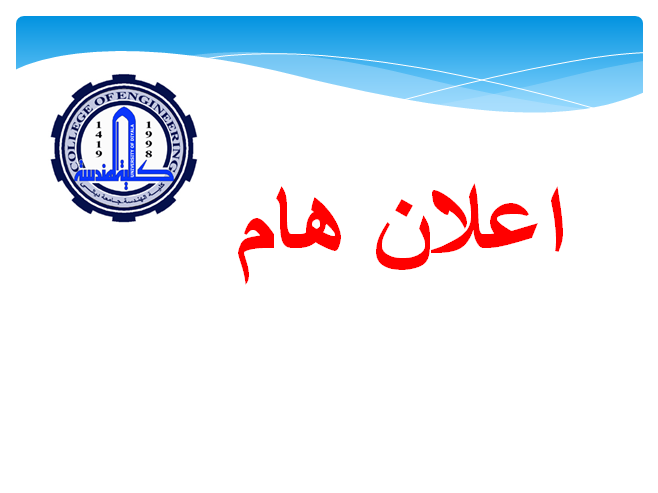 اعلان هام اشارة الى الامر الجامعي ب ت /14903 في 26/10/2015 بتوسعة خطة القبول للدراسات العليا للعام الدراسي 2015-2016 على الطالب من الراسبين في الامتحان التنافسي /المحاولة اولى على دراسة الماجستير / القبول العام /هندسة مدنية (قتيبة صائل محمد ) المباشرة بالدوام الرسمي خلال 14 يوم اعتبارا من صدور الامر الجامعي وبخلافه يلغى قبوله .