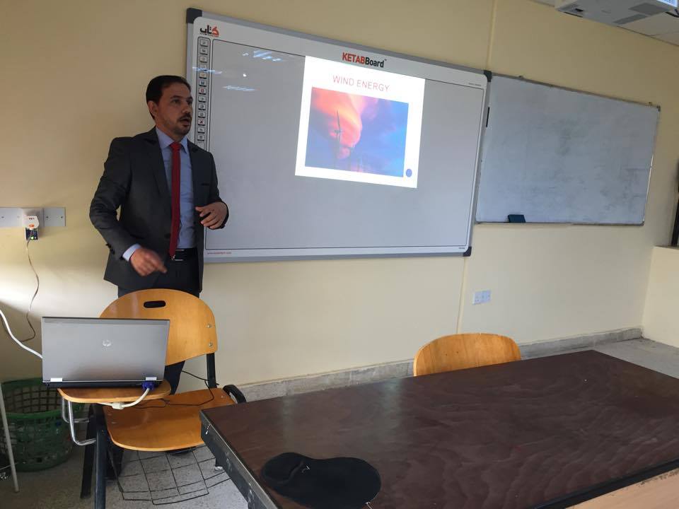 وذلك ضمن سلسلة الحلقات النقاشية التي خطط قسم الهندسة الكيمياوية اقامتها ضمن العام الدراسي 2015/2016. القيت الحلقة النقاشية في يوم الاربعاء الموافق 4/11/2015 وذلك من قبل المدرس المساعد (عمر عبود عمران) في رئاسة القسم وبحضور رئيس و تدريسي وطلبة القسم حيث تناولت الحلقة التعرف على الطاقة المتجددة وانواعها ومصادرها. وكان المحور الاساسي من الحلقة النقاشية هو تصميم وتنفيذ توربينات الرياح الافقية ودراسة كل جزء من هذه التوربينات ومن اين صنعت. وكان الهدف هو الحصول على الطاقة الكهربائية باستغلال طاقة الرياح وذلك باستخدام نظام يتكون من توربينات الرياح الافقية ذات الكفاءة العالية ( horizontal turbine efficient ) ومحرك التيار المستمر ( DC Motor) ) لغرض توليد فولتية قيمتهاV 12 والواح خزن ( Battery ) لغرض خزن فرق الجهد الناتج من المحرك المستمر وايضاً استخدمنا محول الطاقة Inverter ) ) لغرض تحويل التيار المستمر الى التيار المتناوب واستخدمنا ايضاً محول كهربائي رافع للفولتية ( transformer ) لرفع فرق الجهد المتولد من محول الطاقة من 12 فولت الى 220 فولت وبتردد 50 Hz . التي تولد التيارات المستمرة وخزنها داخل ألواح الخزن (البطاريات) وبعد ذلك تحويلها الى تيارات متناوبه بواسطة وقد تخلل الحلقة مداخلات من قبل الحضور ومناقشات.