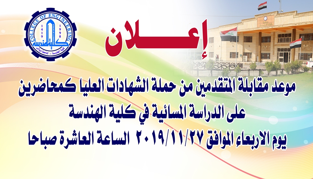 تعلن عمادة كلية الهندسة جامعة ديالى عن موعد اجراء مقابلة المتقدمين بصفة محاضر خارجي في الدراسة المسائية من من حملة الشهادات العليا يوم الاربعاء الموافق 27-11-2019 الساعة العاشرة صباحا مستصحبين معهم كافة المستمسكات الثبوتية