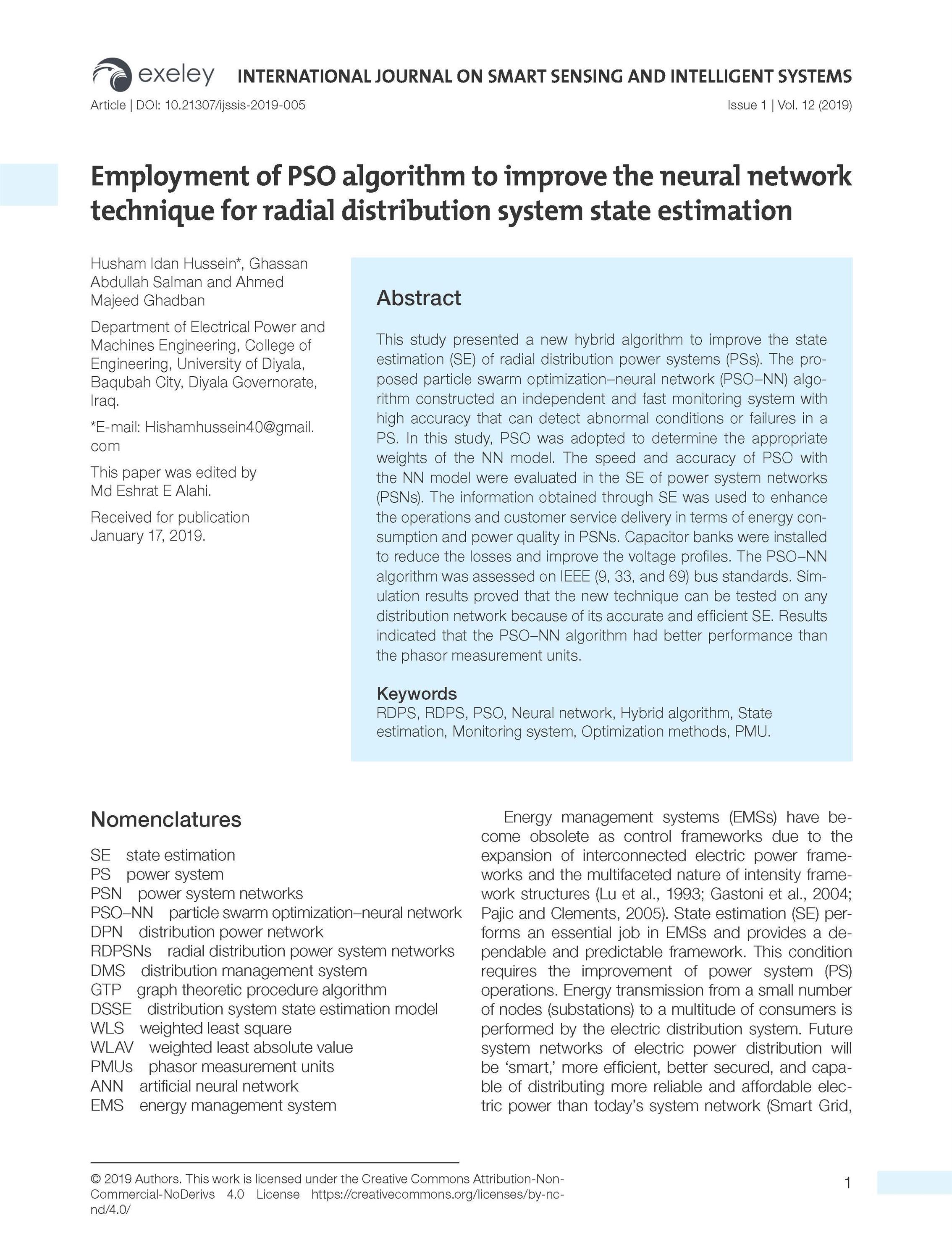 تمكن فريق بحثي مؤلف من ( أ.م. هشام عيدان حسين )،(أ.م. غسان عبدالله سلمان) و (م.احمد مجيد غضبان) اعضاء في الهيئة التدريسية لقسم هندسة القدرة والمكائن الكهربائية من نشر بحثي علمي عالمي في المجلة الدولية للاستشعار الذكي والأنظمة الذكية في نيوزلندا ضمن مستوعبات سكوبس ذات تصنيف Q3 Cite Score 0.61 تحت عنوان :